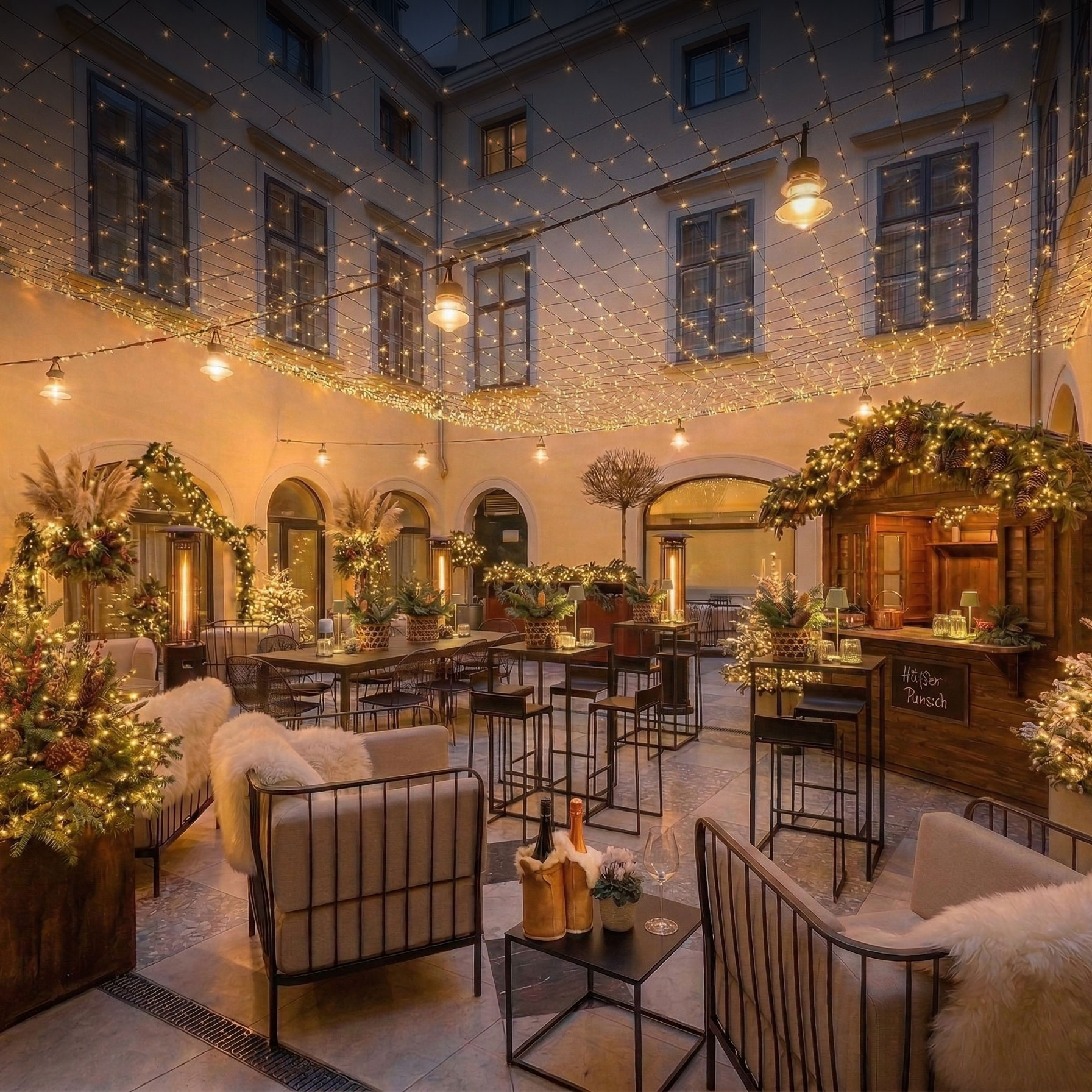 Der historische Innenhof des Palais Mailberger Hof verwandelt sich 2026 in ein funkelndes Winterrefugium – perfekt für besondere Firmenfeiern im Herzen Wiens für bis zu 110 Personen gleichzeitig.